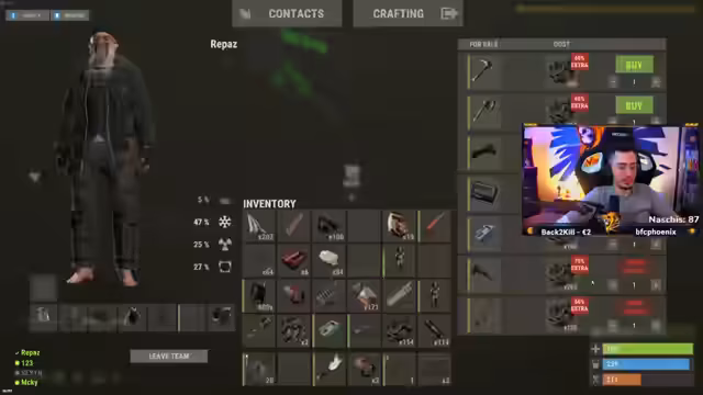 10:42:28Ein erfolgreicher Raids gegen ein feindliches Team namens Trimax wurde durchgeführt, bei dem eine Blue Keycard erbeutet wurde. Anschließend gerät das Team in einen Streit über Platzprobleme in den Kisten, was zu Verzögerungen führt. Es gibt Diskussionen über den Kauf von Helikoptern, welche jedoch als zu schwer und unpraktikabel angesehen werden. Der Streamer äußert den Wunsch, ein RP-Szenario zu initiieren, und sucht nach Teammitgliedern wie 'Vicky'.