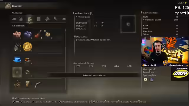 04:02:01Nachdem der Streamer erfolgreich den Fäulnisritter besiegt hat, widmet er sich der Planung des weiteren Vorgehens. Er durchgeht seine Inventare, insbesondere die Schmiedesteine, und entscheidt, seine aktuelle Waffe weiter aufzuwerten. Er erkundert die Möglichkeiten, eine Waffe auf plus 9 zu bringen, und stellt fest, dass dies ein 'Overkill' wäre. Stattdessen konzentriert er sich darauf, seine Rüstung und seine Runenanzahl zu optimieren, um für die kommenden Herausforderungen gerüstet zu sein.