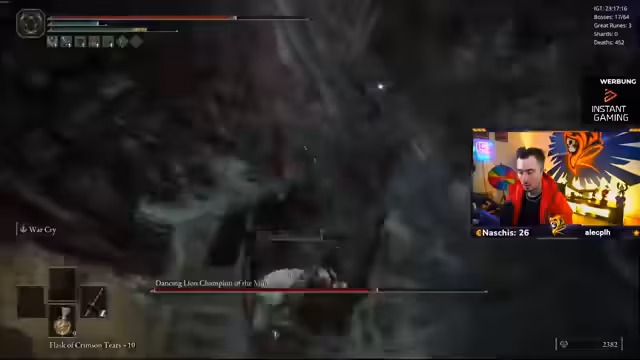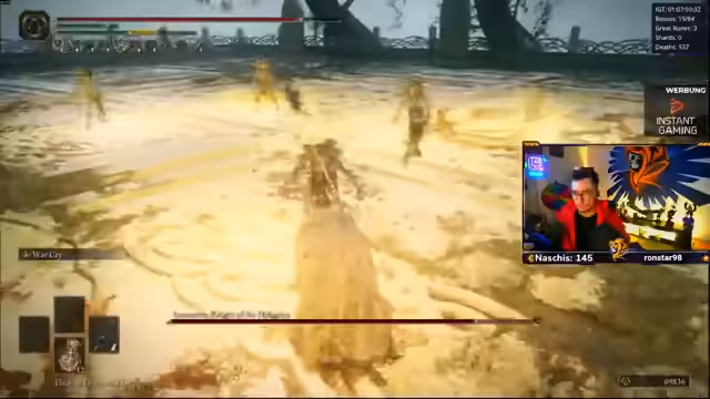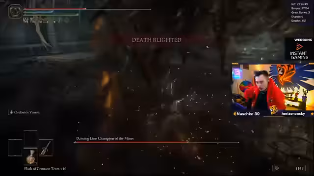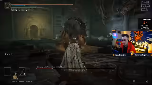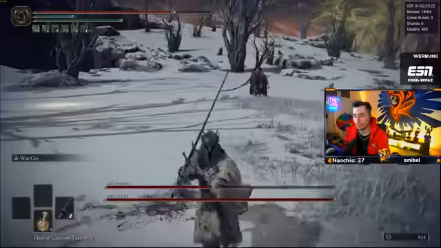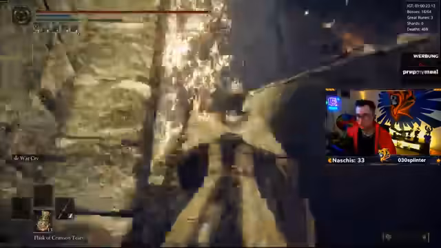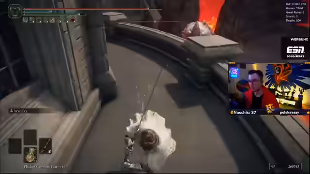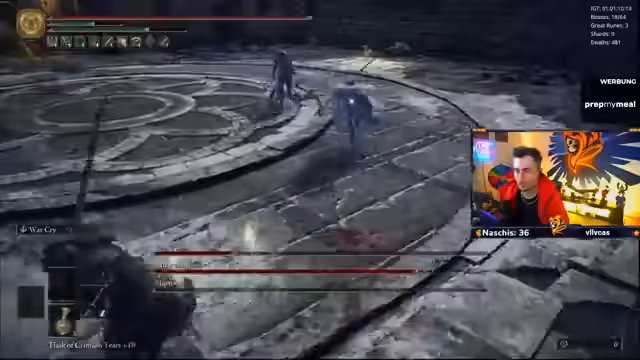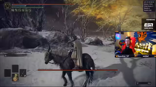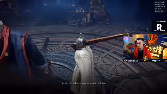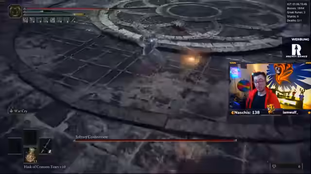 02:00:54Der Fokus verlagert sich komplett auf das Spielen von Elden Ring. Der Streamer kämpft gegen einen normalen Trashmob, der jedoch enormen Haltungsschaden verursacht und sich neu spawnt. Anschließend wird ein Bosskampf gegen einen Gegner mit speziellen Mechaniken unternommen, der Todespest-Arzen beschwört. Der Kampf wird als extrem schwierig und frustrierend beschrieben, da der Boss in verschiedenen Phasen wechselt und der Streamer die Angriffe kaum sieht oder ausweichen kann.