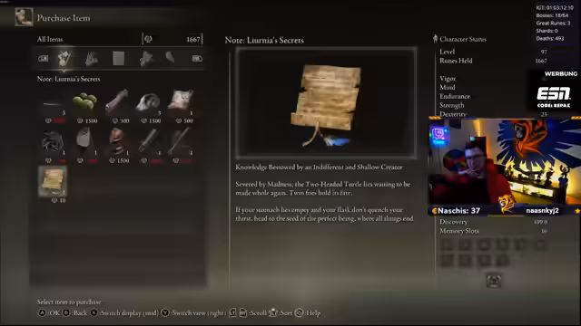 12:03:20Mit den gefarmten Runen wird der Build des Streamers optimiert. Er investiert massiv in Ausdauer, um schwere Rüstung tragen zu können und nicht mehr überladen zu sein. Die Farm-Methode mit den Gaius-Gegnern wird getestet und analysiert, wobei festgestellt wird, dass sie zwar sehr viele Runen einbringt, aber auch mit dem Risiko des Todes verbunden ist. Trotzdem nutzt er diese Methode, um seine Attribute auf das Maximum zu bringen.