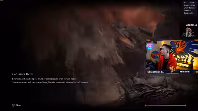 04:23:51Ein Buff wird als äußerst effektiv entdeckt und ermöglicht es, einen Boss schnell zu besiegen. Der Streamer erkundet weiterhin die Welt, um Items wie Tränke, Talismane und Schmiedesteine zu farmen, die den Kampf erleichtern könnten. Er äußert den Wunsch nach stärkeren Upgrades und einem besseren Inventar, da der aktuelle Schaden als 'erbärmlich' beschrieben wird. Jede Erkundung wird als ein Glücksspiel gesehen, da die Items zufällig verteilt sind.