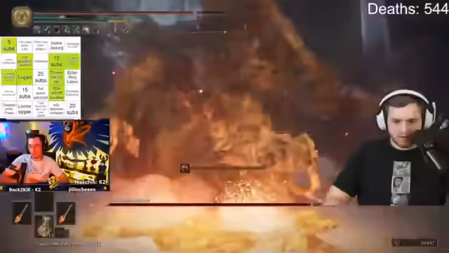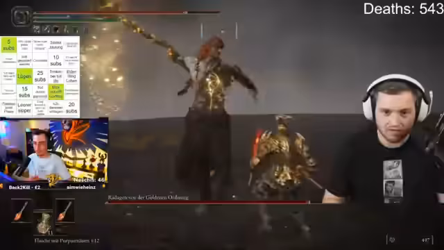 01:14:14Der Kampf gegen Radagon beginnt, und der Streamer stößt auf erhebliche Schwierigkeiten. Besonders eine bestimmte Angriffsform, der sogenannte Nuke, bereitet ihm große Probleme, da er diese nicht ausweichen kann. Trotz mehrerer Versuche gelingt es ihm nicht, den Boss zu besiegen, was zu Frustration und in der Community zu Diskussionen über die Spielmechanik führt.