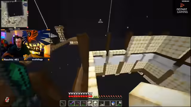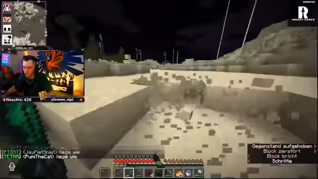 09:52:25Ein bedeutender Meilenstein wird erreicht, als ein Spieler erfolgreich ein Water Emogy platziert, was als bemerkenswerte Leistung gefeiert wird. Danach konzentriert sich das Team darauf, riesige Mengen an Wolle und Glas zu verbauen, wobei der Streamer eine persönliche Statistik zeigt: über 36.000 Wolle-Blöcke wurden platziert. Gleichzeitig wird über den Ursprung des Namens 'Reapers' diskutiert, der sich aus einem alten Videospiel inspiriert, in dem ein Charakter dem Sensenmann gegenüberstand. Die Motivation ist hoch, als ein Countdown für ein Ziel gestartet wird.