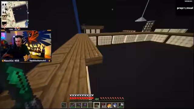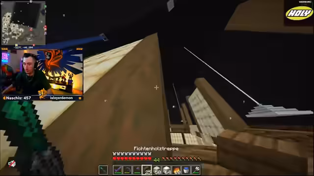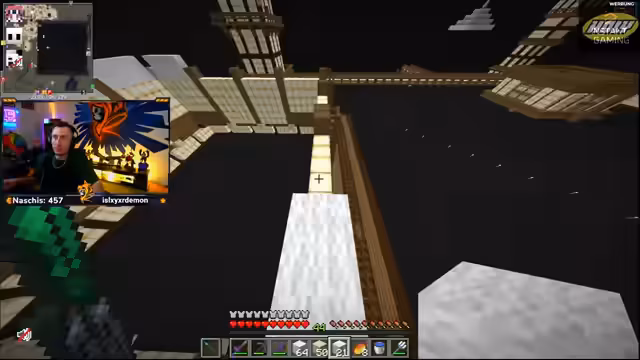 12:57:21Das Hauptaugenmerk liegt auf dem als das größte Gebäude auf dem Server geltenden Projekt. Über dessen weitere Ausführung, insbesondere ob es mehrmals vom Boden aufgebaut oder von der Seite aus gestartet werden soll, wird diskutiert. Der Streamer ist sich der immenseen Zeit- und Arbeitsleistung bewusst, die der Bau des detailreichen Gebäudes erfordert.