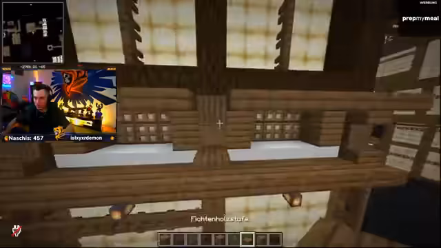 12:19:49Nach der Hauptstruktur wird mit dem Einbau von Dekorationselementen wie Froglights und Treppen fortgefahren. Es wird deutlich, dass der Streamer viele Informationen nicht auswendig behält und ständig auf Screenshots zurückgreifen muss, um das korrekte Muster wiederherzustellen. Bei der Verkleidung der Zwischenwände, die in der Vorlage aus weißen Betonblöcken bestehen, entscheidet sich der Streamer spontan gegen das als "glitchartig" und "unnatürlich" empfundene Material und stattdessen für Holz, was er für besser aussehend hält, um das Ganheitserlebnis zu verbessern.