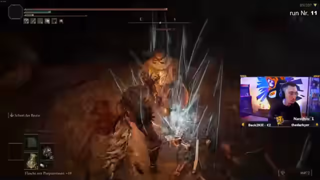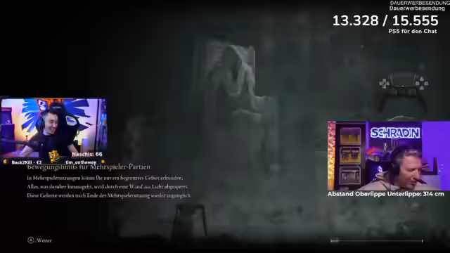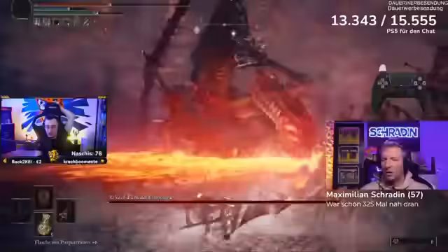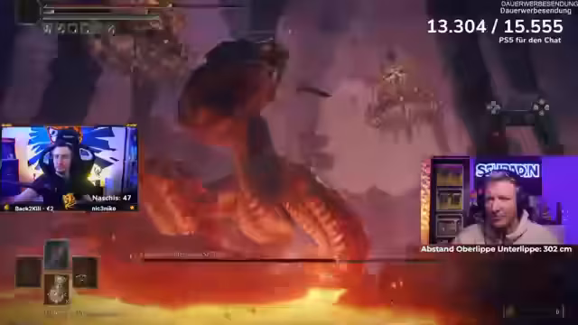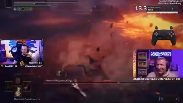 08:23:28Der Stream wechselt zu einer Elden Ring-Session, in der Schradin den Boss Rikard bekämpft. Kommentare konzentrieren sich auf taktische Hinweise, wie die Distanz zum Boss halten, die Lava-Arenafelder vermeiden und den richtigen Zeitpunkt für Angriffe zu wählen. Der Kampf wird als äußerst frustrierend für Schradin beschrieben, der mehrmals stirbt und sich in komischen, wütenden Monologen äußert, was dem Ganzen eine komische Note verleiht.
