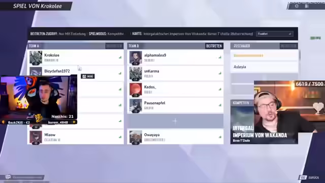 03:04:10Es wird diskutiert, warum es keine Banns im Turnier gibt, um zu verhindern, dass Spieler, insbesondere neue, ihre einzigen gelernten Charaktere verlieren und den Spaß am Spiel verlieren. Die erste Runde der Gruppenphase wird festgelegt: Team Dalu gegen Team Kaddi und Team Jen gegen Team Horus in Gruppe A, sowie Team Kroko gegen Asmugl in Gruppe B. Es wird spekuliert, wer im Team von Asmugl der stärkste Spieler ist. Die Wichtigkeit, im Competitive-Modus zu spielen, wird noch einmal betont. Die Teamcaptains sollen Bescheid geben, wenn ihre Lobby voll und bereit ist. Es wird überlegt, welches Match-Up man sich zuerst ansehen soll. Die ungefähre Startzeit für das erste Spiel wird auf Viertel nach bis 20 nach festgelegt. Die Spieler tauschen sich über ihre Ränge im Spiel aus und diskutieren, welche Ränge es noch über ihnen gibt. Es wird überlegt, warum ein Top-500-Spieler an dem Turnier teilnimmt. Die Spieler werden aufgefordert, sich bei Fragen zu melden. Es wird betont, dass es keine Banns gibt und somit Feuer frei ist. Die Spieler tauschen Freundschaftsanfragen aus und klären organisatorische Fragen, wie z.B. wann man auf die Toilette gehen darf.