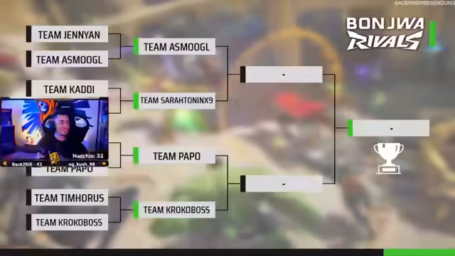 05:27:00Nach der ersten Turnierrunde haben sich vier Teams für die Halbfinalphase qualifiziert: Asmugl, Sara, Papo und Kroko. Die Paarungen wurden festgelegt: Asmugl trifft auf Sara, und Papo auf Kroko. Krokos Team wird als starker Favorit gehandhabt, da der Spieler in der Woche massiv aufgestiegen ist und sich als hochrangiger Spieler etabliert hat. Die Auslosung verspricht spannende und ausgeglichene Duelle auf Augenhöhe.