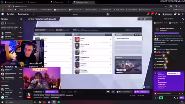 02:12:48Die Diskussionen über die Heldenwahl werden hitziger. Der Streamer kritisiert die Auswahl von "Black Panther" auf einer bestimmten Map scharf und argumentiert, dass der Held nur auf Angriffsrollen effektiv sei und eine Verteidigung fast unmache. Er betont, dass ein "Tank"-Held auf der Map unerlässlich sei, da sie sich auf einen engen Punkt konzentrieren müssen. Ein Mitspieler namens "Kroko" wird für seine Passivität kritisiert, da er AFK (Away From Keyboard) sei und sich nicht ins Teamgefüge einbringe.