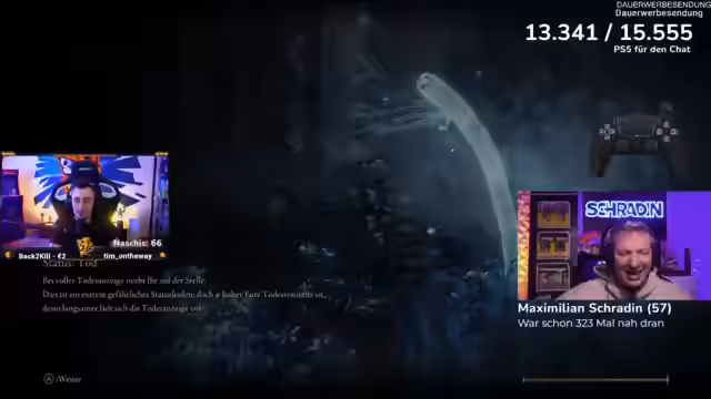09:01:36Es wird geplant, mit Schradin an den No-Death-Run fortzufahren und gleichzeitig einen gemeinsamen Stream mit der Streamerin Rosemondi zu organisieren. Die Kommunikation über die zukünftigen Pläne und potenziellen Gäste wird im Chat diskutiert. Gleichzeitig wird ein Feedback für Schradins Spielstil gegeben, wobei trotz wiederholter Fehler eine Lernkurbe festgestellt wird.