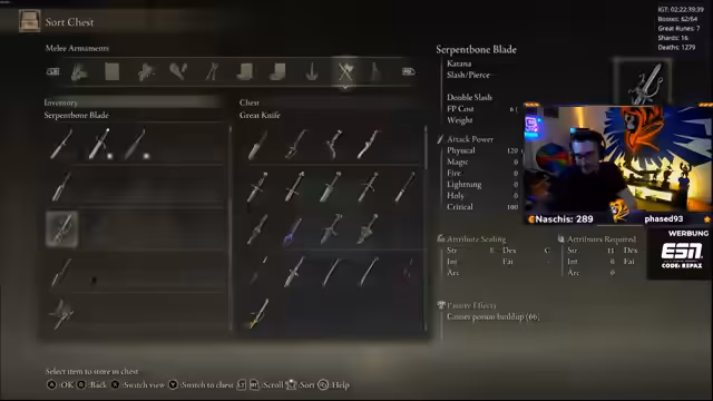 06:38:19Für den Kampf wird intensiv über die optimale Waffe diskutiert. Die 'Flammenberge' werden als potenzielle beste Wahl angesehen, da sie sowohl Haltungsschaden als auch Frost und Blutung verursachen können. Allerdings werden auch Alternaten wie das 'Drachen-Katana' oder die 'treuen Sternen-Fäuste' in Betracht gezogen. Die Entscheidung ist abhängig von der Notwendigkeit, schnell Status-Effekte zu applen. Die Waffe muss auf Stärke und Arkan-Energie ausgelegt sein, um die Blutungs-Wirkung zu maximieren, während Intelligenz als unnötig erachtet wird.