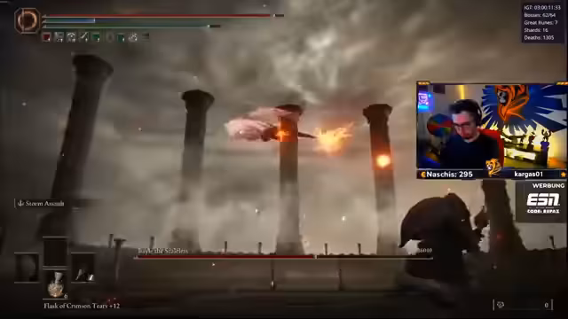 08:41:47Trotz mehrerer Versuche gelingt es dem Streamer nicht, Bail zu besiegen. Die Attacken in Phase 2, insbesondere eine bestimmte Flammen- und Luftattacke, werden als extrem schwierig zum Ausweichen beschrieben. Die enge Zeit zum Ausweichen (I-Frames) macht eine fehlerfreie Ausführung (flawless) zur Notwendigkeit. Der Streamer äußert Frustration darüber, den Moveset nicht mehr vollständig zu beherrschen, und sieht den Kampf als kontraproduktives Lernen an, da das wiederholte Scheitern die Erschöpfung fördert und nicht zum Erfolg führt.