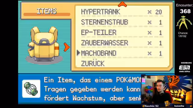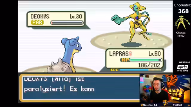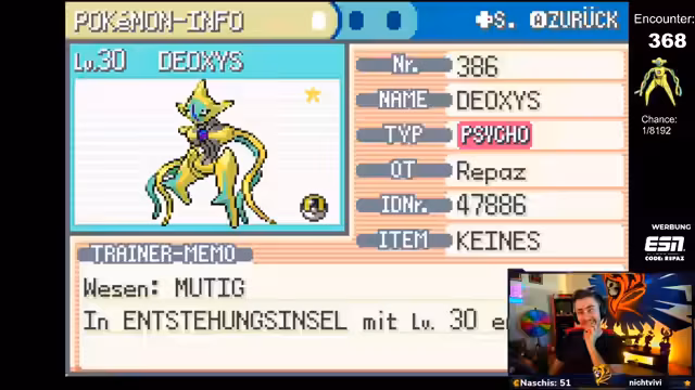 05:15:34Nach einer langen Shinysuche, die 368 Begegnungen gedauert hat, gelingt es dem Streamer, ein Shiny Deoxys zu fangen. Dies löst große Freude und Erleichterung aus. Erfolgreiche Shinys, wie dieses, werden als besondere Errungenschaften innerhalb des Streams gefeiert und markieren oft einen Höhepunkt für das Publikum.