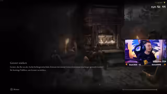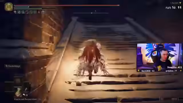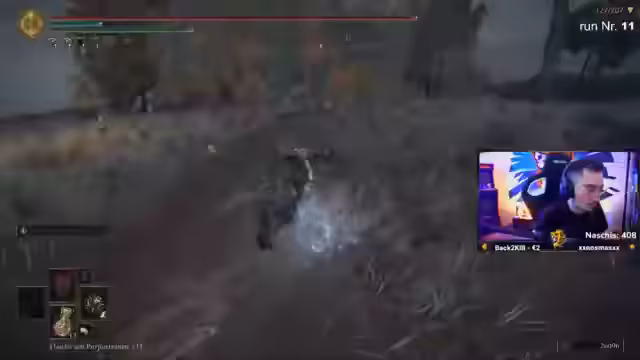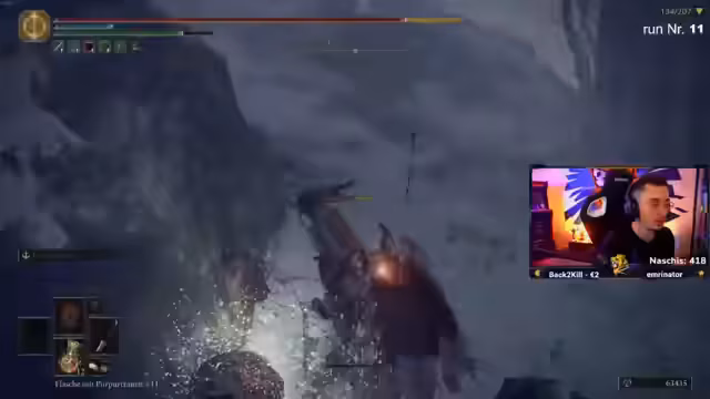 00:54:13Nachdem der Geldtunnel und weitere Höhlen wie die der Sternfallbestie erkundet wurden, hat der Streamer einen bemerkenswerten Erfolg: er hat die Hälfte der 207 Bosse im Randomizer besiegt. Gleichzeitig stößt er auf neue Bedrohungen wie einen Nox-Mönch und den Drachenjäger-Gideon. Gideon löst aufgrund seiner früheren Erfolge gegen den Streamer große Angst aus. Der Run schreitet nun in Richtung Nokron und die zentralen Bosse werden immer gefährlicher.