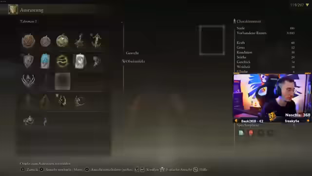 00:17:14Während des Runs werden die gefundenen Talismen genauer analysiert. Der Streamer diskutiert den Wechsel zwischen offensiven Talismanen wie Gunst des Erdenbaums und defensiven Optionen wie dem grünen Schildrötentalismus, um die Balance zwischen Damage und Tankiness zu finden. Zudem werden die Resistenzwerte wie Robustheit gegen Blutung und Immunität gegen Gift erklärt, um die richtige Ausrüstungswahl für die bevorstehenden Bosse zu treffen. Das Equipment wird optimiert, um auf die Sprintangriffe des Builds ausgelegt zu sein.