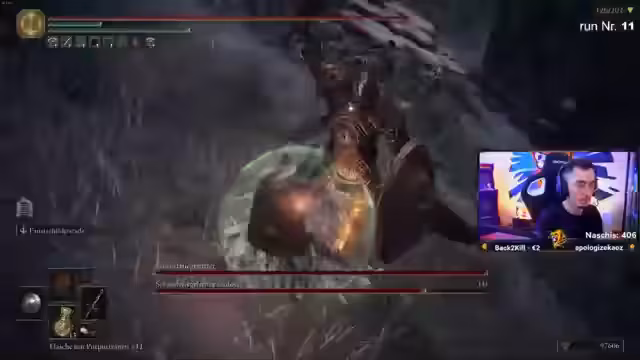 11:05:54Nachdem er die Regionen südlich der Schneelandschaften abgeschlossen hat, befindet er sich im Gebirge der Riesen. Er hat nun Glaube auf 15 und wichtige Talismane und bereitet sich auf die finalen Bosse vor. Er hat alle Gegenstände gesammelt und seine Waffe mit der Flamme, gib mir Kraft-Waffe aufgewertet. Bale, der stärkste Drache, wird als möglicher Boss identifiziert und löst große Nervosität aus.