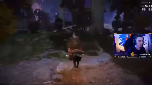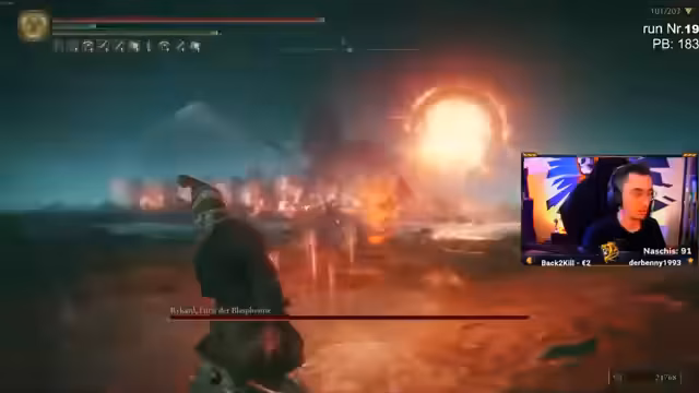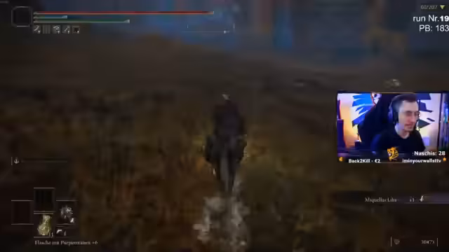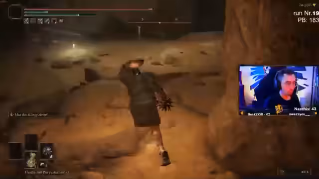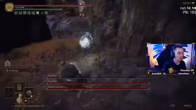 12:19:32Bei der Erkundung eines bestimmten Spots in Gelmir trifft der Streamer unerwartet auf den Boss Theodorix. Dies ist extrem unwahrscheinlich, da er in nur drei von 19 Runs je an dieser Stelle war. Der Boss gilt als extrem gefährlich, da er den Spieler bei niedrigem Leben mit einem Schlag töten kann. Die Begegnung wird als frustrierend und respektlos beschrieben.