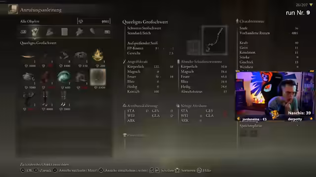 03:42:06Zu Beginn des Streams stehen die Waffen und Attribute im Fokus. Nachdem eine Waffe verkauft wurde, zeigt der Streamer Frustration über die eingeschränkten Optionen. Er experimentiert mit verschiedenen Waffen wie Runenbogen und Sperre, stößt aber auf statische Anforderungen. Die Entscheidung fällt auf die Schwerter der Großsterne, welche 13 Geschick benötigen. Dies führt zu intensiven Berechnungen über die benötigten Seelen, um die Attribute zu erhöhen und die Waffe nutzbar zu machen.