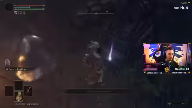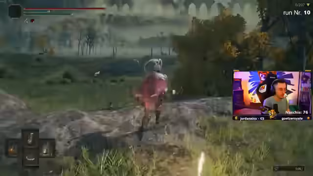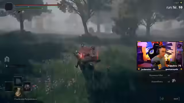 11:26:16Der Stream wechselt zu einem Elden Ring-Spiel im 'No Death Run'-Modus mit Randomizer. Nach einem sehr starken Start mit Godrics großer Rune und hohen Statistiken, stellt der Streamer das große Problem der mangelhaften Heilmittel fest. Diese sind so schwach, dass für eine vollständige Heilung fünf Heiltränke benötigt werden, was den Run extrem gefährlich macht, besonders in Dungeons.