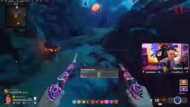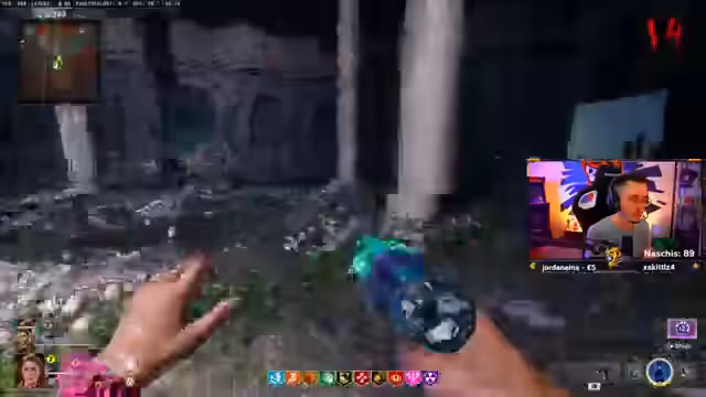 06:57:49Der Streamer erkundet die neue Zombies-Map und bemerkt eine Vielzahl an violetten Kristallen, die respawnen. Es gibt Hypothesen, dass man mit diesen interagieren muss, z.B. den Zombie töten, während er lila leuchtet oder ihn durch Kristalle hindurchziehen muss. Gleichzeitig werden die Schlüsselobjekte wie der Eisstab und dunkle Energie identifiziert und Verbindungen zu Pekka Punch und dem Bosskampf hergestellt.