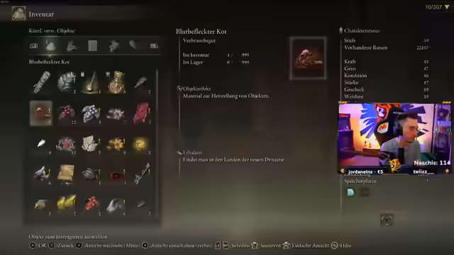 14:04:25Trotz der Sorgen um den Schlüssel nutzt der Streamer die gesammelten Echos von Bossen, um eine große Menge an Seelen zu farmen. Er ist auf ein sehr hohes Level gestiegen und investiert die Punkte hauptsächlich in Ausdauer, um tankiger zu werden. Gleichzeitig zeigt er sich begeistert von neuen Talismanen, wie dem Talisman gegen Blitzschaden, die seinen Build weiter stärken.