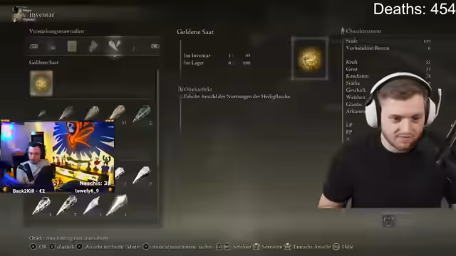 05:46:31Der Streamer schließt die Waffensuche und zeigt im Inventory gefundene Waffen. Er bewertet eine gefundene Waffe als „S-Tier-OP“ und entscheidet, sie nicht zu nutzen, da sie im Meta steht. Die Entscheidung für die Magma-Blades ist endgültig gefallen. Er bittet Max, sich auf den Bosskampf mit Malenia vorzubereiten und macht sich bereit, die Waffen selbst zu farmen, während Max seinen eigenen Weg im Spiel weitergeht.
