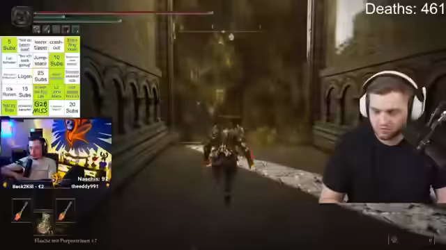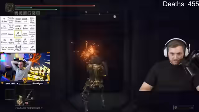 07:39:00Während des Streamers Kampfes gegen Maliketh treten technische Probleme auf. Der Stream und der Audio-Input der Discord-Übertragung sind gestört, was zu einer unvorhersehbaren Situation führt. Nach einem Neustart des Streams wird der Kampf fortgesetzt. Der Streamer diskutiert den Bosskampf selbst, lobt das Design und die Cutscenes, und konfrontiert einen vermeintlichen Bug, bei dem der Boss nach einer Cutscene sofort wieder gestaggered ist. Dies wird von einem Zuschauer als 'Tenet'-Verhalten identifiziert.