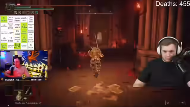 10:37:17Der Streamer konzentriert sich auf den Bosskampf gegen Gideon Ofnir. Es werden verschiedene Strategien und Items wie Arzneimischungen und Tränke getestet, um dessen hohe Schadensoutput zu überstehen. Gideon gilt als sehr schwer, seine Attacken wie die unausweichlichen Scheiben und die mächtige Nuke, die 80% des Lebensbalken verursacht, werden als extrem herausfordernd beschrieben. Der Streamer hat Schwierigkeiten, die Muster der Angriffe zu erkennen und sucht erfolglos nach einem Trick oder Cheese, um den Boss zu bezwingen.