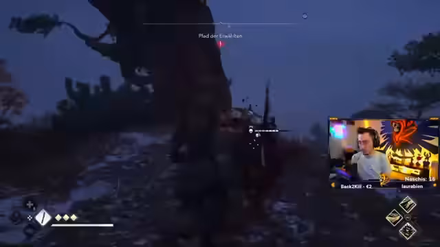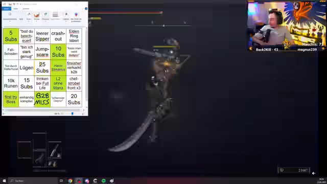 02:01:09Der Streamer kämpft gegen einen Boss in einem anspruchsvollen Nebenquest-Abschnitt. Der Kampf zieht sich über rund zehn Minuten hin und ist von ständigen Dodges und Schadensverlusten geprägt. Das Gefühl der Unterlegenheit und Frustration ist spürbar, da der Gegner den Streamer constantly unter Druck setzt und sich sogar heilt. Der Kampf endet schließlich, aber mit einem Gefühl des Ausgelaugtseins.