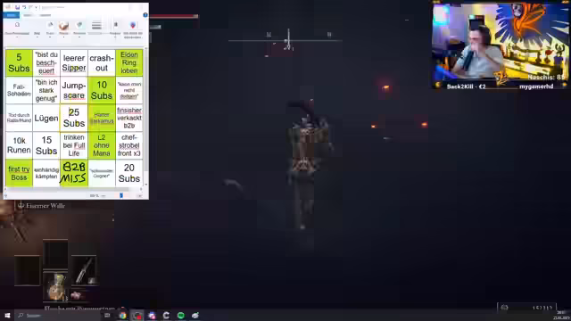 05:43:46Der Streamer farmt gezielt in vulkanischen Gebieten und kämpft gegen starke Gegner wie Lava-Salamander, wobei er auf hohe Schäden achten muss. Währenddessen füllt sich das BINGO-Feld der Zuschauer zusehends, da Challenges wie „Back to back miss“ oder „Trinken bei Full-Life“ getriggert werden. Es entsteht eine interaktive Dynamik, bei der der Streamer und seine Community gemeinsam auf die Erreichung von BINGO hinarbeiten.
