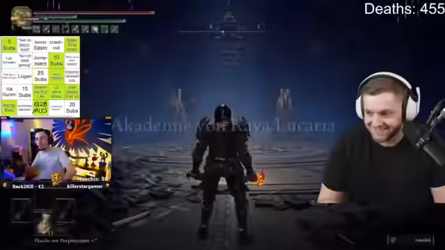 10:47:29Aufgrund der anhaltenden Schwierigkeiten wird eine Wette gestartet, ob der Boss in sieben Versuchen besiegt werden kann. Der Streamer versucht mehrfach, die Attacken zu doggen und auszuweichen, wird aber häufig durch Kombinationen aus Schwertern, Scheiben und der Nuke getötet. Jeder Try wird genau analysiert, besonders das Timing der Angriffe und die daraus resultierenden unweigerlichen One-Shots. Der Streamer fühlt sich von der KI des Bosses verarscht und findet keine Lösung, um seine Schadensresistenzen oder seine Taktik effektiv zu verbessern.