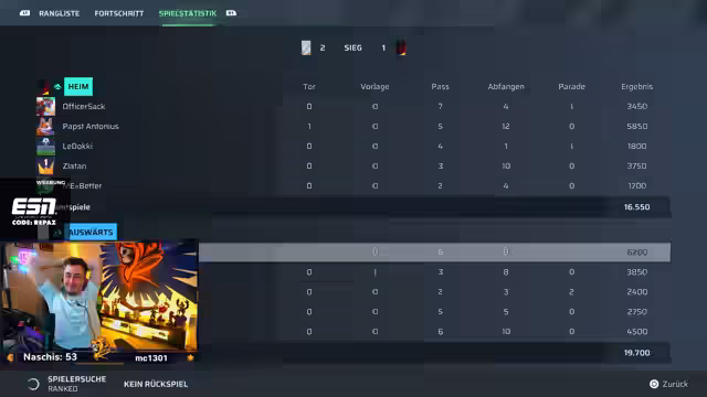 06:22:22Nach einem extrem spannenden und langen Spiel, das über 12 Minuten Nachspielzeit hatte, zeugt der Streamer von einem außergewöhnlichen Match. Er lobt die gegnerische Mannschaft für ihre starke Abwehr, die keine Fehler zuließ, und hebt den gegnerischen Torwart hervor, der 'crazy' aufgespielt und nichts zugelassen habe. Das Spiel beschreibt er als 'geisteskranke Spiel' und findet es 'krank geil'. Daraufhin fordert er ein direktes Rückspiel, da ihm das Niveau und der Spaß am Spiel so gefallen haben, dass er sich sofort messen will.