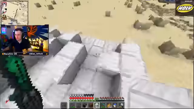 01:52:01Die Arbeit in Minecraft geht weiter. Es wird an verschiedenen Stellen gebaut: an einer Basis, Häusern und Brücken. Der Fokus liegt auf der Platzierung von Sandstein und Terraforming, um die Umgebung optisch ansprechender zu gestalten. Als Bauleiter gibt der Streamer Anweisungen und verteilt Aufgaben an das Team, um den Fortschritt im Projekt voranzutreiben.