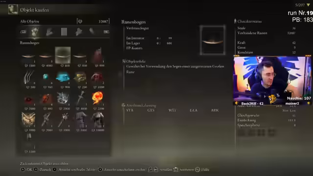 03:29:11Nach einem Neustart des Runs legt der Streamer einen außergewöhnlich starken Start hin. Er findet sofort Rykards Echo, was ihm durch das Duplizieren mit einer Schildkröte 100.000 Runen bringt. Zudem findet er den Gold-Skarabäus-Talisman, der passiv 20% mehr Runen bei jedem Sieg generiert, und das eiserne Schleifmesser, eine starke Waffe für den frühen Spielverlauf.