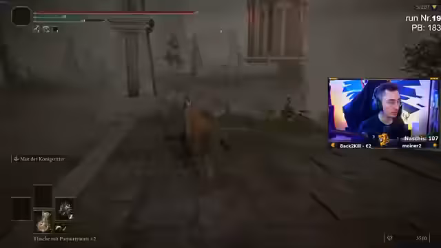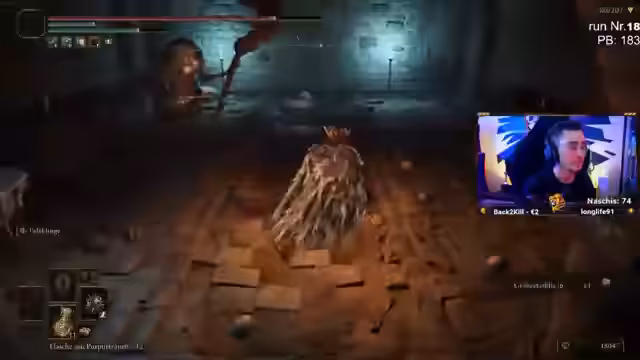 00:17:36Der Streamer konzentriert sich darauf, die verbleibenden Nacht-Bosse zu besiegen. Er kämpft gegen starke Gegner wie einen Irak-Lobster, der trotz geringer Lebenspunkte extrem hohen Schaden verursacht. Nach dem Sieg über einen Nacht-Boss, den er mit Distanzangriffen bekämpft, bleibt ihm nur noch Radagon als finaler Boss im Run. Er äußert seine Sorge vor diesem Kampf wegen der schwierigen Arena der vielen NPCs.
