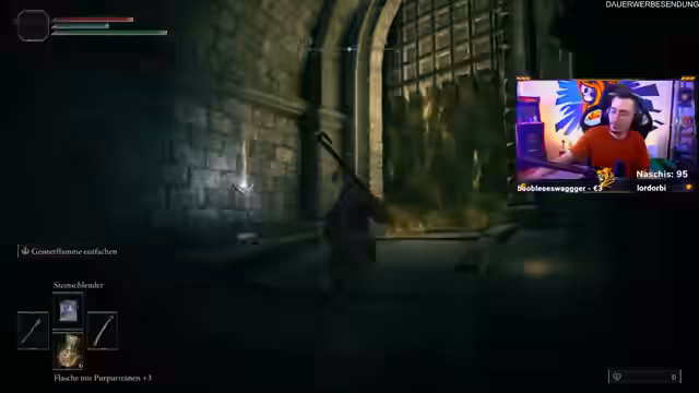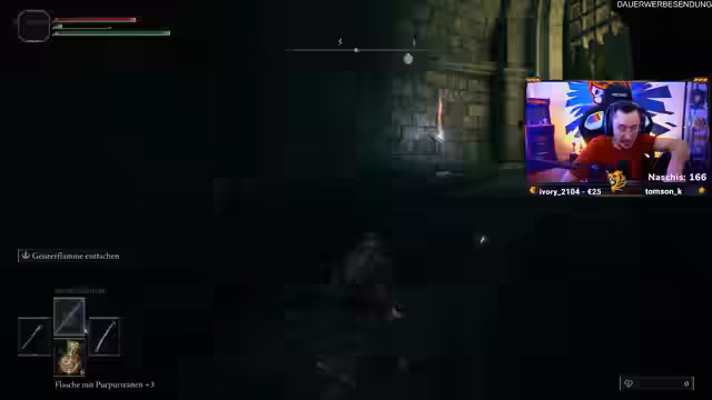 08:03:29Schradin hat Schwierigkeiten, Items zu finden und stürzt versehentlich in einen Schlitz, was für Frustration sorgt. Nach einigen Irrwegen und dem erfolgreichen Einsammeln der Runen wird beschlossen, die Waffe beim Schmied zu verbessern. Der Weg zum Schmied wird geplant, inklusive eines Teleports zu einer Gnade, um den letzten Stein für das Waffen-Upgrade zu holen. Es wird angekündigt, dass man sich danach Margit widmen kann. Auf dem Weg dorthin stirbt Schradin erneut und muss seine Runen zurückholen, bevor es dann endlich weitergeht. Der Streamer gibt Anweisungen, wie man sicher über die Brücke kommt, um das letzte Item einzusammeln, was jedoch mit einem weiteren Tod endet. Trotzdem wird das Item eingesammelt, und die Runen müssen erneut geborgen werden. Es wird angekündigt, dass die Tränke verbessert werden müssen, bevor Margit angegriffen wird.