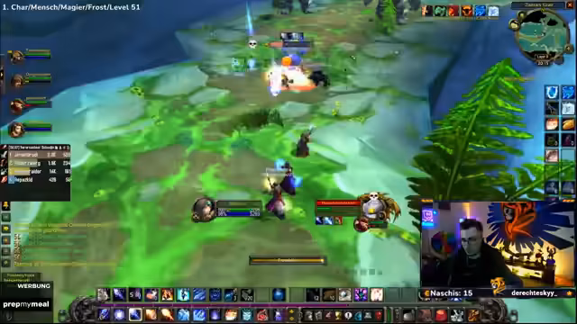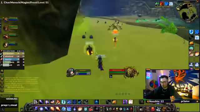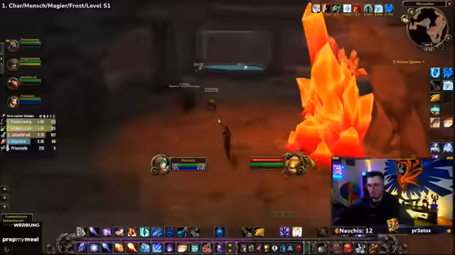 07:13:35Der Streamer und ein Mitspieler bereiten sich auf einen Bosskampf in einer Höhle vor. Sie überlegen, wie sie den Kampf strategisch angehen können, und planen, einen Rare Mob zu sheepen. Der Kampf verläuft erfolgreich, der Streamer lobt den hohen Schaden seines Partners und erwähnt, dass der Boss nur grünen Müll droppt. Anschließend reden sie über die Effektivität von AOE-Farming in dem Gebiet.