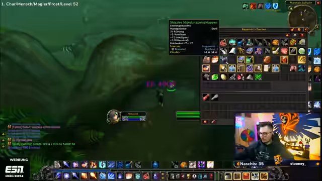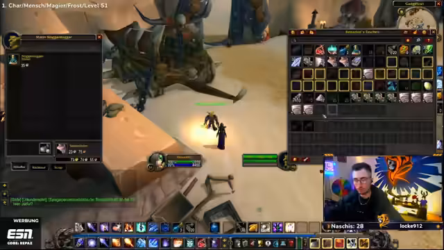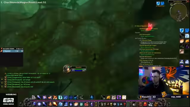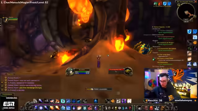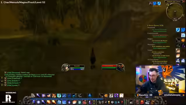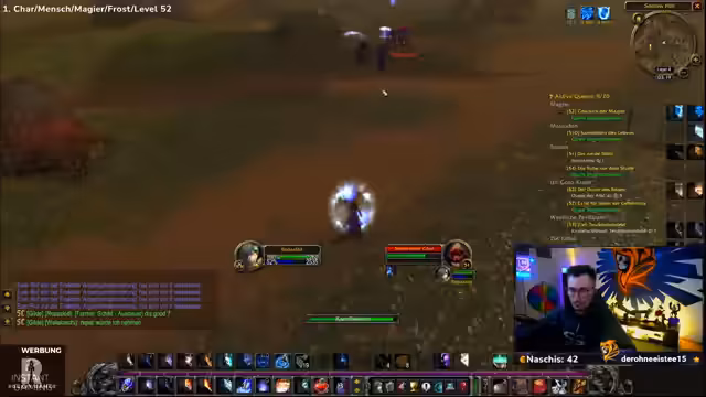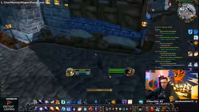 06:46:17Der Streamer startet im Hinterland und spricht mit Spielern wie Spinky, Schmuse-Tiger und Mini-Chief. Es werden Quests angenommen und abgegeben, darunter die Superkleber-Quest und der Rundenstein aus Marvon Reverseekers Werkstatt. Der Fokus liegt auf dem Sammeln von Erfahrungspunkten (XP), wobei ein starker XP-Balken durch das Schlafen in Gasthäusern erreicht wird. Der Streamer bemerkt, dass er durch das Abschließen vieler Quests schnell Level aufsteigt und bereits Level 52 erreicht hat.