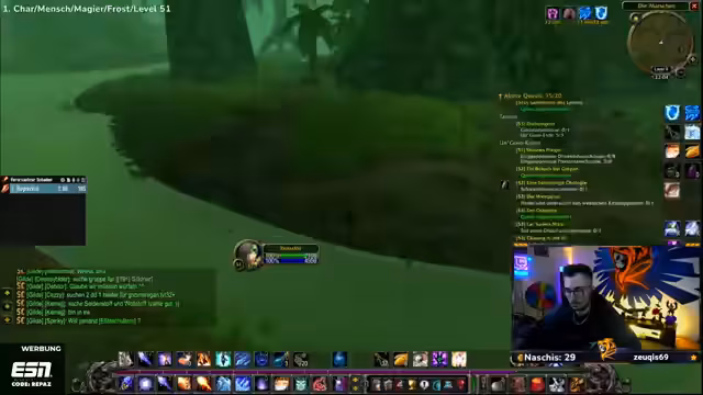 08:03:59Nachdem das Gebiet als zu voll und nervig empfunden wurde, überlegen der Streamer und sein Mitspieler, als nächstes in das Teufelswald zu ziehen. Sie haben jedoch Schwierigkeiten, ihre Quests in den bisherigen Gebieten abzugeben. Der Streamer erwähnt das Projekt 'Hahn', das einen Twink, eine Zweitschar, erstellt. Schließlich entscheiden sie sich, in die Sümpfe des Elends zu reiten, um einen Flugpunkt zu holen und PvP-Flag zu aktivieren, was den nächsten Teil der Abenteuer ankündigt.