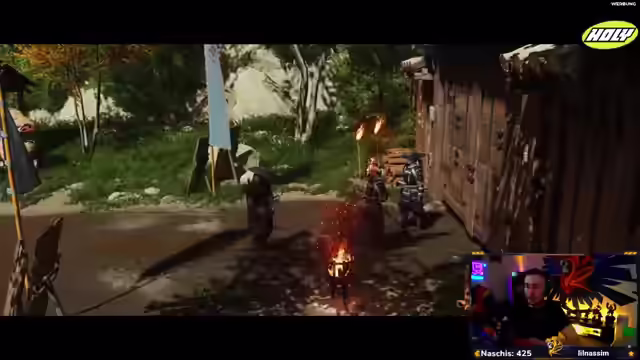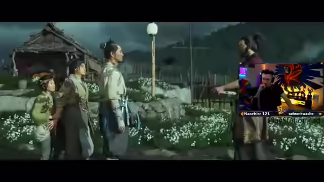 00:41:55Der Streamer äußert sich begeistert von der Musik und der Grafik des Spiels. Er erhält den Auftrag, den Rest der JT6 zu finden, und erfährt, dass sich der alte Doppelkatanameister im alten Gasthaus verstecken soll. Er entdeckt, dass man durch weiße Blumen reiten kann, um einen Geschwindigkeitsschub zu erhalten. Nach einer Auseinandersetzung mit einem Kind, das er versehentlich angreift, trifft er auf eine Frau, die ihm von einem Schmied erzählt, der ihr ein Pferd verkauft hat. Er nimmt eine Nebenquest an, um die Pferde zu finden. Es wird erwähnt, dass das Spiel sowohl Open-World- als auch Story-lastig ist.
