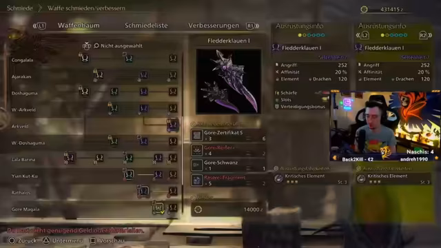 02:30:43Der Streamer startet eine Jagd auf Jinderhard, wobei er auf Kälteprobleme stößt und einen Kältekäfer oder ein Eisgetränk verwendet. Er fragt nach Möglichkeiten, die Chancen auf Edelsteine zu erhöhen und konzentriert sich darauf, den Schwanz des Monsters abzutrennen, da dies angeblich die Wahrscheinlichkeit erhöht. Nach dem erfolgreichen Abtrennen des Schwanzes wird die Jagd fortgesetzt, wobei der Streamer sich über den Verlust der maximalen Ausdauer wundert. Am Ende der Jagd erhält er jedoch nicht den gewünschten Edelstein, was zu Frustration führt. Er spricht über Quests, die eine 100%ige Chance auf einen Edelstein bieten und lässt sich von Zuschauern aufklären. Anschließend schmiedet er eine Atean-Waffe und überlegt, ob er für Drachen gehen soll, da die Waffen alle ähnlich aussehen und er sie nicht besonders ansprechend findet. Er zieht in Erwägung, eine Zweitwaffe mit einem anderen Element zu nutzen und diskutiert die Nützlichkeit verschiedener Elemente wie Feuer und Explosionen.