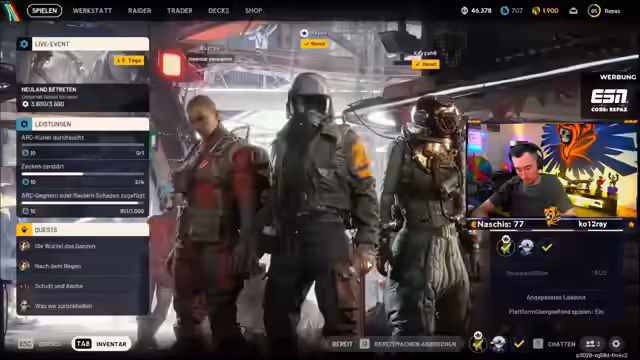 09:41:02Der Stream ist geprägt von einem dynamischen und intensiven Kampfgeschehen in Arc Raiders. Der Fokus liegt auf taktischen Manövern, dem Erkunden von Gegnerpositionen und riskanten Aktionen. Der Spieler beschreibt wiederholt knappe Situationen, in denen er Gegner mit Waffen wie der Bobcat oder dem Toro bekämpft, oft aus unvorteilhaften Positionen. Die Gespräche drehen sich um das Vorrücken in der Map, das Platzieren von Schilden und das Erkennen von gegnerischen Bewegungen und Schwachstellen. Das Ziel ist es, sich einen Weg freizukämpfen und letztendlich erfolgreich auszusteigen, wobei die Aktionen oft unter Zeitdruck und mit hoher Gefährdung erfolgen.