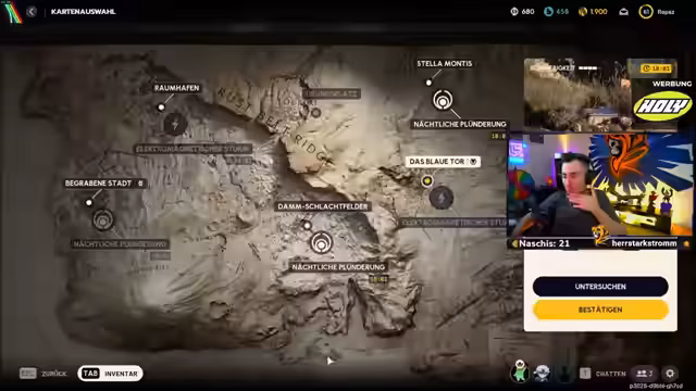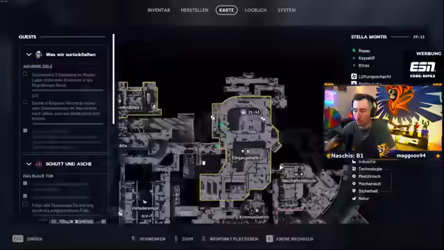 03:13:37Nach einer erfolgreichen Runde auf Stellarmontes entscheidet sich das Team, die Map zu wechseln und das Ankunftsgebäude als neues Ziel zu erkunden. Der Streamer gibt an, diese Map weniger zu mögen, aber es geht darum, neue Loot-Spots und Action zu finden. Der Anfang der Runde ist geprägt von der Orientierung im neuen und unübersichtlichen Gelände.