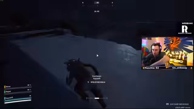 03:44:08Während des Rückzugs wird das Streamer-Team von mehreren Gegner-Teams gleichzeitig bedroht. Manche Gegner halten sich in erhöhten Positionen und greifen von oben an, während andere versuchen, den Weg zu blockieren. Das Team versucht, die Situation mit taktischen Mitteln wie Minen und dem Einsatz von Gas zu entschärfen, doch der Druck ist enorm. Es kommt zu einem hektischen Austausch von Schüssen, wobei einige Teammitglieder bereits angeschlagen sind und es nur mit Mühe gelingt, die Positionen zu halten oder zu wechseln.