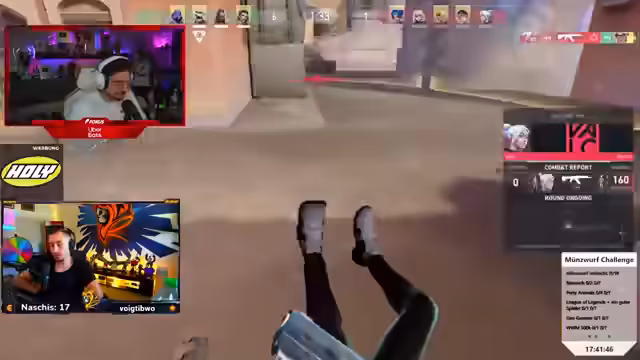 02:30:24Nachdem das Team Fortnite-Siege und Münzwürfe erreicht hat, ist der Streamer jedoch weiterhin unzufrieden mit dem Spiel. Er kündigt an, dass jetzt ein Wechsel zu Valorant ansteht, um dort auf einem Server mit 200 Pinger eine Runde zu spielen. Gleichzeitig denkt er über neue spielerische Herausforderungen nach, wie eine "Win Challenge", in der er in verschiedenen Spielen einen Sieg erzielen müsste.