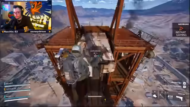 04:45:53Das Team erkundet eine Trone im Parcours und plant, sie zu zerstören, um eine Bastion zu erreichen. Es wird entschieden, stattdessen einen Aufzug zu nutzen, um die Position sicherer zu erreichen. Während des Vormarsches wird ein Gegner getötet und gelootet, wobei wertvolle Gegenstände wie eine Toro, Anvils und Magnetbesteuerungstealer erbeutet werden. Das Team muss vorsichtig agieren, um in Deckung zu gehen und den Sturzschaden zu vermeiden, während es versucht, den Zielort zu erreichen.