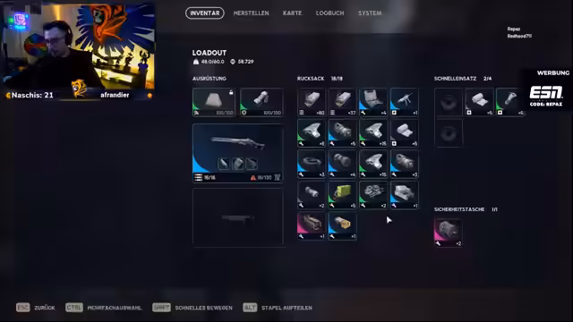 01:13:19Beide Spieler bereiten sich auf den Trio-Kampf mit Trymacs vor. Es werden verschiedene Loadouts und Waffenausrüstungen diskutiert. Der Streamer entscheidet sich für eine Venator mit Munition und verschiedene Granatentypen. Es wird über die Notwendigkeit von Schildaufladern und den Farmbedarf an Ressourcen gesprochen. Die fehlenden Schilde werden als Problem identifiziert und es wird eine kurze Farm-Session angedacht, um das Inventar aufzufüllen.