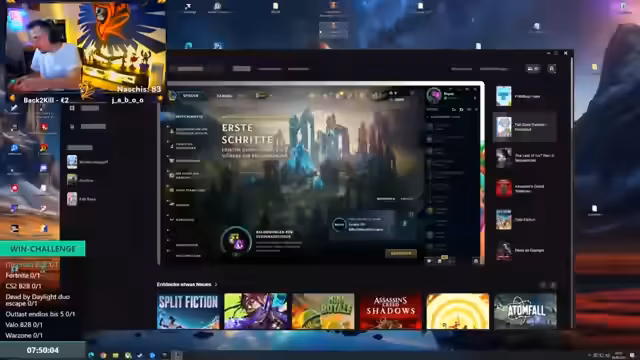 00:08:09Der Stream beginnt mit einer Begrüßung der Zuschauer und einer Ankündigung einer langen Gaming-Session von 14 Stunden. Im Mittelpunkt steht eine geplante Duo-Win-Challenge mit @krokoboss, die um 14 Uhr starten soll. Der Streamer äußert seine Unzufriedenheit über die mögliche Verspätung seines Partners und listet die anvisierten Spiele auf, darunter CS2, Dead by Daylight, Hunt Showdown, Fortnite, Mario Kart, Outlast Trials, Rocket League, VALORANT, League of Legends und DBD. Er betont, dass es sich um eine sehr anspruchsvolle Challenge mit hohem Schwierigkeitsgrad handelt, da in den meisten Games High-MMR-Lobbys gespielt werden.