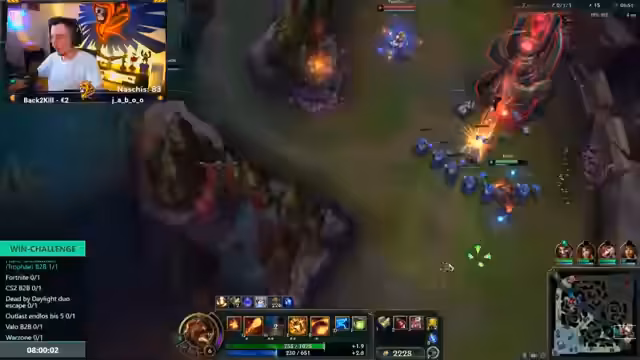 08:39:30Während des Spiels kämpft der Streamer mit der Spielmechanik und seinem eigenen Champion, wobei er unzufrieden mit seiner Leistung und der des Teams ist. Er beschreibt das Spiel als 'fickt' und 'scheiß', was seine wachsende Frustration widerspiegelt. Es kommt zu Toden und strategischen Fehlern, die den Verlauf der Partie negativ beeinflussen. Der Streamer versucht, die Effekte seiner Fähigkeiten zu verstehen, scheitert aber an der praktischen Umsetzung und stellt fest, dass sein Champion 'keine Ahnung' hat, was zu einem frustrierenden Spielerlebnis führt.