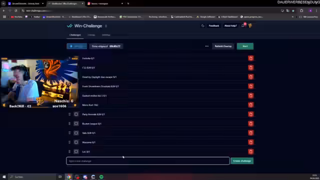00:09:03Es wird eine Winchallenge mit Kroko geben. Gestern Abend im Stream wurde nochmals betont, dass Kroko ausgeschlafen sein soll. Es wird eine lange Session von 14 Stunden erwartet, die bis 4 Uhr morgens dauern könnte. Die Win-Challenge umfasst eine Vielzahl von Spielen, darunter CS2, Dead by Daylight, Hunt Showdown, Fortnite, VALO, Mario Kart, Outlast, DBD und League of Legends. Es wird betont, dass es sich um eine anspruchsvolle Challenge handelt, da in den meisten Spielen High-MMR-Lobbys gespielt werden, was das Matchmaking besonders schwer macht. Ein besonderer Fokus liegt auf League of Legends, auf das nicht viel Lust besteht, aber Kroko zuliebe gespielt wird. Es wird befürchtet, dass Kroko in League of Legends 'hostage' nehmen könnte, was zu Gegenmaßnahmen in anderen Spielen führen würde.